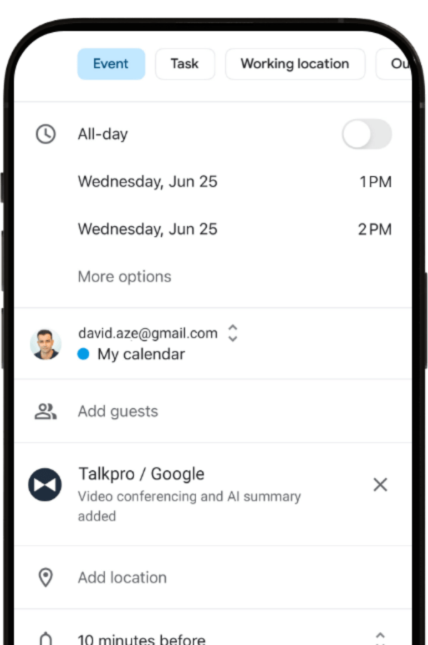 TalkPro is built specifically for professionals. It automatically summarizes conversations, tracks action items, syncs with your Google account, and protects privacy by default. No bots. No third parties.